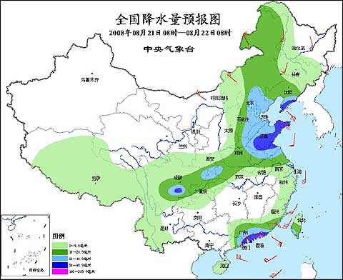 2008年8月21日8時—8月22日8時全國降水量預報圖