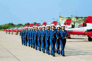 銀白色頭盔,天藍(lán)色飛行服,在紅白相間的戰(zhàn)鷹映襯下,整裝待發(fā)的女飛行學(xué)員顯得英姿颯爽。“開車!”隨著指揮員、飛行大隊(duì)長(zhǎng)孫光輝一聲令下,剎那間,發(fā)動(dòng)機(jī)轟鳴震天撼地,戰(zhàn)鷹依次滑進(jìn)跑道,以雷霆萬鈞之勢(shì)直沖云天。