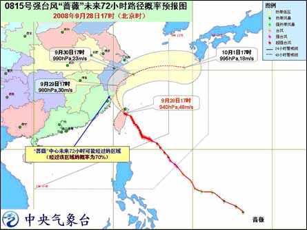 受“薔薇”影響,今天晚上到明天白天,東海、臺灣海峽、巴士海峽、巴林塘海峽、臺灣以東洋面、南海東北部、臺灣省及其沿海、浙江沿海、福建沿海、廣東東部沿海將有7-10級大風,部分海域或地區的風力可達11-12級,“薔薇”中心經過的附近海面或地區風力可達13-15級,最大陣風可達16-17級;長江口區也將有6-8級大風;臺灣大部以及福建東部和北部、浙江東部和南部將有大到暴雨,其中福建東北部、浙江東南部、臺灣的部分地區有大暴雨或特大暴雨。