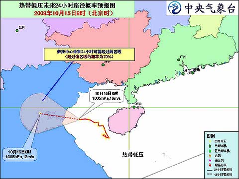 中央氣象臺2008年10月15日10時發布熱帶低壓消息:目前在北部灣海面活動的熱帶低壓的中心今天上午8時位于越南清化省清化市東南方大約125公里的海面上,就是北緯19.2度、東經106.8度,中心附近最大風力有7級(16米/秒)。