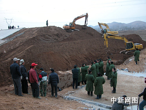 記者23日下午在現場看到,發生跑水的渠段已被從南北兩側攔截,有五六輛挖掘機正在作業,干渠被截開近一丈寬的口子,渠底一條橫貫東西的水泥槽已明顯裸露出來。十幾個穿綠大衣的人站在截開的渠北側,許多施工人員聚攏周圍。