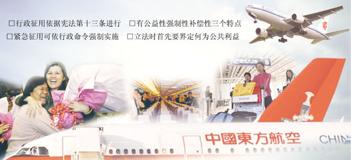 記者在采訪中了解到,我國目前沒有對行政征用進(jìn)行專門的立法,行政征用除了有憲法的依據(jù)外,還散見于其他法律法規(guī)之中,如涉及消防、抗洪、抗震等。但針對征用機場、客機的具體規(guī)定,還是空白。