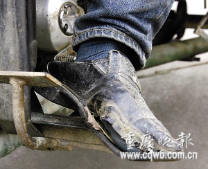 一路的奔波使得皮鞋破舊不堪 記者 錢波 攝