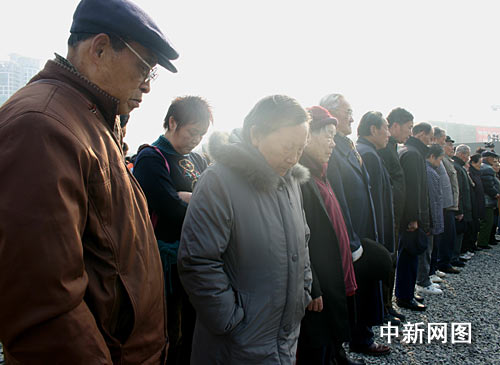 冬日的南京顯得陰冷。早上十時,警報聲中,聚集在紀念館悼念廣場的三千軍民低首默哀三分鐘,并向遇難同胞三鞠躬。