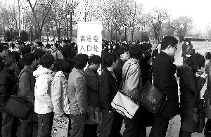 早晨8點,國展門外已排起長隊,隊伍一直延續到200米外的北三環輔路上。由于人多,國展在原有10個固定售票口之余,另開辟了5、6個臨時售票口。大門外不少人兜售鮮花,為今天招聘會增添了一些浪漫。
