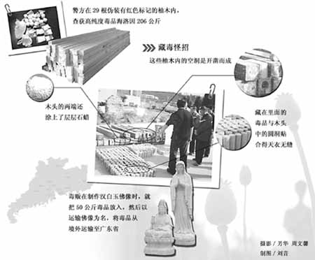 2003年7月,馬國祥以每公斤13萬元的價格從“阿強”手中購買藏在漢白玉佛像里的海洛因50公斤。據了解,“阿強”等人在制作漢白玉佛像時,就把毒品放入,然后以運輸佛像為名,將毒品從境外運輸至廣東省。