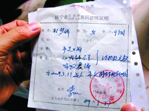 程傳勝,28歲,巨野縣章縫鎮(zhèn)程莊村人,他出具的女兒“診斷證明”上記載,程夢嬌被診斷為“手足口病、心力不全、呼吸衰竭”,于2009年3月17日死亡,“特作此證明!边@份證明上,蓋有濟寧市傳染病醫(yī)院門診部的紅色印章。