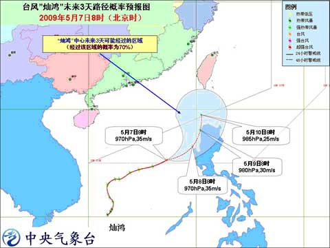 中新網5月7日電 中央氣象臺2009年5月7日10時發布熱帶氣旋公報:今年第2號強熱帶風暴“燦鴻”于今天上午加強為臺風,上午8時其中心位于東沙群島以南大約590公里的南海中部海面上,就是北緯15.3度,東經117.3度,中心附近最大風力有12級(35米/秒)。