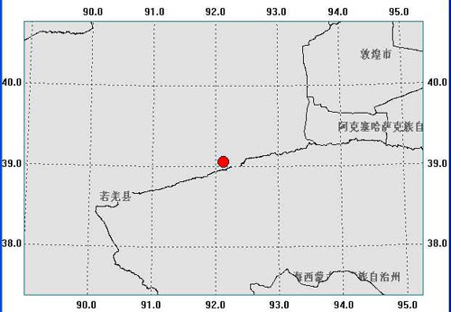 據測定,此次地震震中位于北緯三十九點一度, 東經九十二點一度。目前還沒有人員傷亡和財產損失的報告。