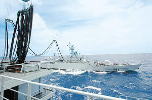踏平怒海,“青海湖”艦與“蘭州”艦、“昆侖山”艦、“巢湖”艦劈浪前進。記者看到,在自動控制裝置的作用下,凌空飛架的鋼索隨著艦艇搖擺伸縮自如。為這3艘戰艦進行干貨補給后,“青海湖”艦又分別為“常德”艦、“湘潭”艦進行了油水補給。演練歷時7小時53分鐘,先后完成了食品補給、醫療救護、海上救生、彈藥補充等課目,全面錘煉了支援艦與戰斗艦之間的相互配合能力。