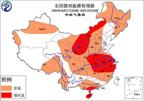 中新網(wǎng)6月17日電 中央氣象臺(tái)18時(shí)發(fā)布強(qiáng)對(duì)流天氣預(yù)報(bào),預(yù)計(jì)今天夜間到明天白天,新疆北部和西南部、西北地區(qū)東部、內(nèi)蒙古大部、華北大部、東北大部、青藏高原東部、西南地區(qū)西南部和東北部、黃淮大部、湖北、江淮、江南大部、華南中南部等地將有雷暴天氣,其中,甘肅東部、寧夏、陜西北部、內(nèi)蒙古中東部地區(qū)局地有冰雹、短時(shí)強(qiáng)降水、雷雨大風(fēng)等強(qiáng)對(duì)流天氣,河南南部、安徽、江蘇大部、湖北大部、湖南東北部、江西北部、浙江、上海、福建北部、廣西東南部、廣東西南部、海南局部有短時(shí)強(qiáng)降水、雷雨大風(fēng)等強(qiáng)對(duì)流天氣。