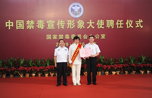 國(guó)家禁毒委員會(huì)辦公室常務(wù)副主任、公安部禁毒局局長(zhǎng)楊鳳瑞為中國(guó)禁毒宣傳形象大使成龍頒發(fā)聘書(shū)并佩戴綬帶。