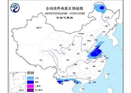 中新網7月6日電 中央氣象臺6日06時發布暴雨預報:預計今天白天到夜間,內蒙古東北部、黑龍江西北部、山東南部和東部、河南南部、蘇皖中北部、云南南部、廣西南部等地的部分地區有大雨。
