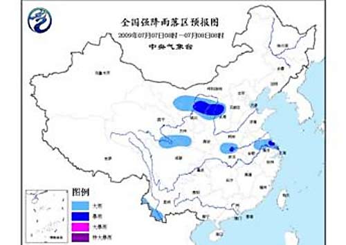 中新網7月7日電 中央氣象臺今日06時繼續發布暴雨預報:預計,今天白天到夜間, 內蒙古西部、寧夏北部、陜西北部、山西北部、青海東南部、甘肅南部、四川北部、河南南部、湖北北部、蘇皖中南部、云南西南部等地的部分地區有大雨,其中內蒙古河套地區、陜西北部、山西北部、湖北東北部、江蘇中部等地的部分地區有暴雨。