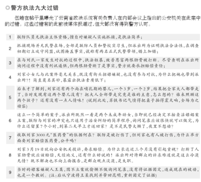 帖子中,伍皓披露云南省政法系統有關負責人在聽取調查進展報告過程中,“用了半個多小時詳細指出公安機關的過錯”。“當案情逐漸清晰,特別是查出劉家的兩個女兒互換衣服、故意誘導聯防抓錯人以實施敲詐的情節,基層公安機關都覺得松了一口氣,有人在匯報中說‘看來案子并沒有辦錯’,有關負責人立即怒目圓瞪、厲聲喝斥,‘什么沒有辦錯!這個案子,我們公安機關是有過錯的’!”