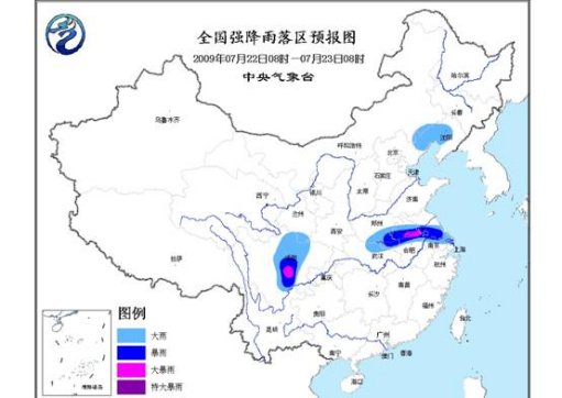 中新網7月22日電 中央氣象臺22日06時發布暴雨預報:預計,今天白天到夜間, 遼寧西北部、河南南部、安徽中北部、江蘇中南部、湖北北部、甘肅東南部、四川中部等地的部分地區有大到暴雨, 其中,四川盆地西南部、安徽中部、江蘇中部的局部地區有大暴雨。上述部分地區并伴有短時雷雨大風等強對流天氣。