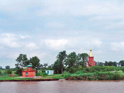 隨著輪船一聲氣笛,黑瞎子島已近在眼前,最先進入記者視線的是黑瞎子島上的標志物——俄羅斯小教堂,其金碧輝煌的穹頂,非常醒目。