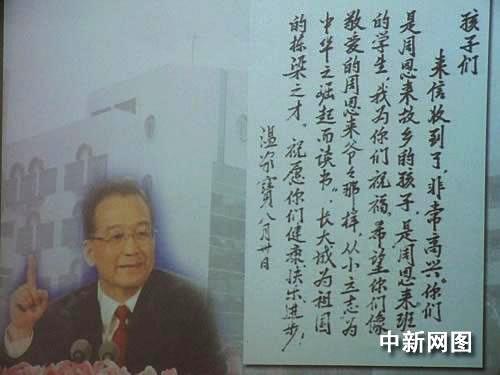 時(shí)隔兩個(gè)多月,讓孩子們激動(dòng)萬(wàn)分的是居然盼到了溫總理的親筆回信。溫總理在回信中說(shuō):“你們是周恩來(lái)故鄉(xiāng)的孩子,是‘周恩來(lái)班’的學(xué)生,我為你們祝福。希望你們像敬愛(ài)的周恩來(lái)爺爺那樣從小立志‘為中華之崛起而讀書’,長(zhǎng)大成為祖國(guó)的棟梁之才。”