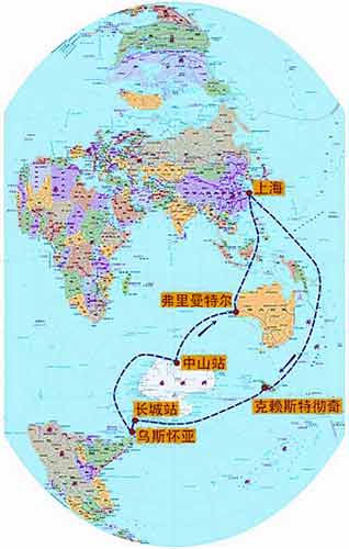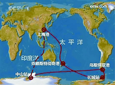 按計劃,雪龍?zhí)柎诵械拇笾侣肪是:從上海經(jīng)新西蘭的克萊斯特徹奇港到長城站,再從長城站到阿根廷的烏斯懷亞港進(jìn)行補(bǔ)給,后經(jīng)此港到達(dá)中山站,完成科考任務(wù)后返回上海。