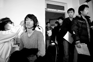 體檢內容包括內外科中的眼、耳、聽力、身高、體重、心電圖、血尿,以及心理、毒品、艾滋病等多項檢查,在視力檢查室,等待檢查的應屆學生已排起了長隊,主檢醫(yī)生對應征青年視力的各項指標進行了檢查,包括近視、斜視、色盲等內容。主檢醫(yī)生告訴記者,每年因視力不合格的占應征者的30%左右。