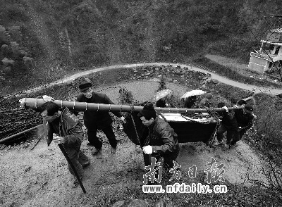 昨日下午,南方日報記者承租了4輛汽車,輾轉鄉村摩的,最后坐輪渡過廖家坪水庫,艱難進入山澗中的陰山排村時,村落的峽溪邊哀樂低回,不到1米寬的泥漿路上擺滿黑色棺材,哭聲震徹湖南安化高明鄉連綿的群山。一片青綠下,大山下白衣素裹。