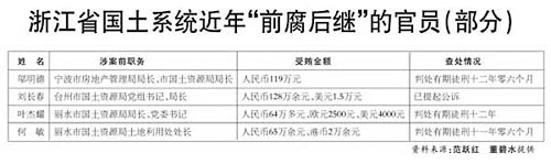 事實上,據統計,不僅是浙江,近年來落馬的貪官不少都與房地產潛規則下的腐敗有關,財政部原副部長朱志剛,北京市原副市長劉志華,山東省委原副書記、青島市委原書記杜世成,天津市政法委原副書記、天津市人民檢察院原檢察長李寶金,湖南省郴州市原市委書記李大倫,安徽省原副省長何閩旭,昆明市規劃局原局長曾華,上海房地局原副局長殷國元,江蘇省蘇州市原副市長姜人杰,重慶市規劃局原局長蔣勇,重慶市沙坪壩區原副區長陳明,福州市國土資源局原局長王炳毅,福州市倉山區土地局原局長李仲……都與房地產腐敗有關。