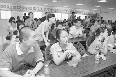 2009年8月26日,福建省廈門市,2009年秋季外來務(wù)工人員子女就讀公辦小學(xué)派位現(xiàn)場,家長焦急地看著派位結(jié)果。廈門市思明區(qū)和湖里區(qū)舉行秋季公辦小學(xué)一年級招收進(jìn)城務(wù)工人員子女入學(xué)的電腦派位。兩區(qū)共計(jì)有3142名進(jìn)城務(wù)工人員子女被派入公辦小學(xué)。