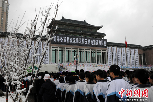 中新網西寧4月21日電(記者 符永康)西寧地區各族、各界群眾參加的悼念大會今天上午10時舉行,上萬群眾為在玉樹地震中遇難的同胞默哀三分鐘。