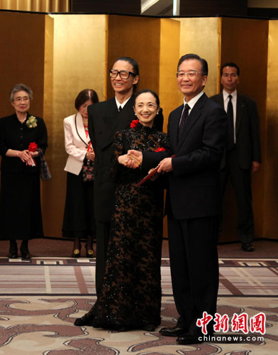 圖為溫家寶向日本松山芭蕾舞團總代表清水哲太郎、森下洋子夫婦頒獎。中新社記者 周兆軍 攝