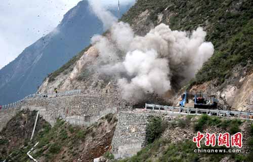 現場對危巖進行爆破爆破。 劉忠俊 攝