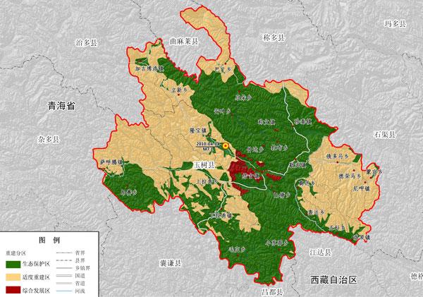 災(zāi)后恢復(fù)重建要與三江源、隆寶自然保護(hù)區(qū)規(guī)劃相銜接,根據(jù)資源環(huán)境承載能力綜合評價,將規(guī)劃區(qū)國土空間劃分為生態(tài)保護(hù)區(qū)、適度重建區(qū)和綜合發(fā)展區(qū)。