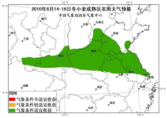 預計6月14-16日,陜西南部和關中、山西西南部、河北南部、河南中北部、山東西部和南部、安徽中北部和江蘇麥收區以晴到多云天氣為主,適宜冬小麥收獲晾曬和夏播作物播種。
