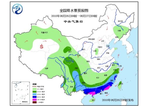 中新網6月26日電 中央氣象臺26日6時發布短期天氣預報顯示,未來三天,青藏高原及其以東大部地區多降雨天氣,其中,浙江南部、江西南部、福建大部、廣西中南部、廣東大部等地有大雨或暴雨,局地有大暴雨;云南西北部和東部、貴州西部和南部、四川盆地南部、黑龍江東部等地有大雨;上述部分地區并伴有短時雷雨大風或冰雹等強對流天氣。