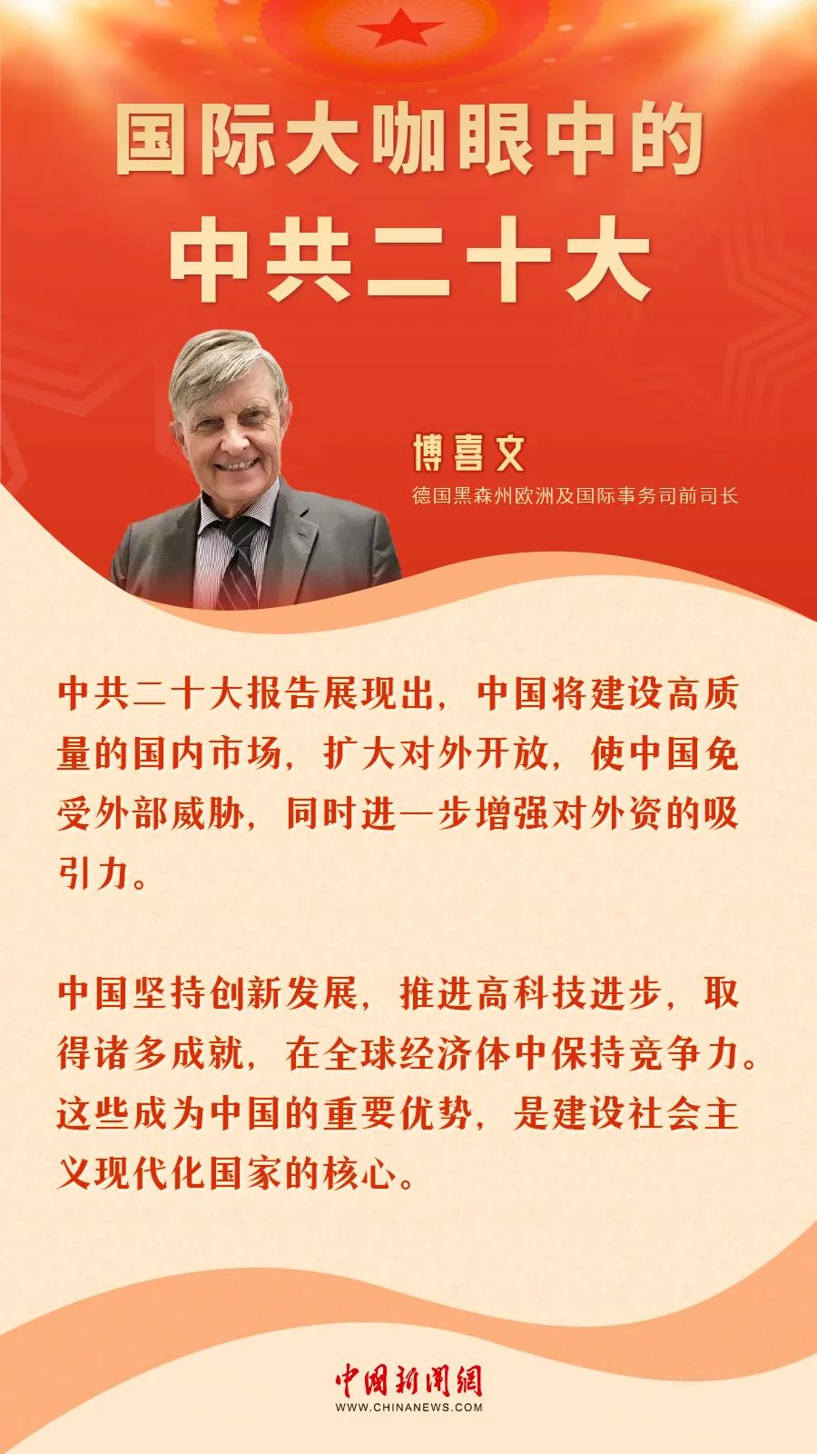 國際輿論表示中共二十大擘畫中國未來發(fā)展藍(lán)圖,為今后發(fā)展指明道路,為現(xiàn)代化建設(shè)奠定基礎(chǔ),并評論稱中國一定能實現(xiàn)奮斗目標(biāo)。