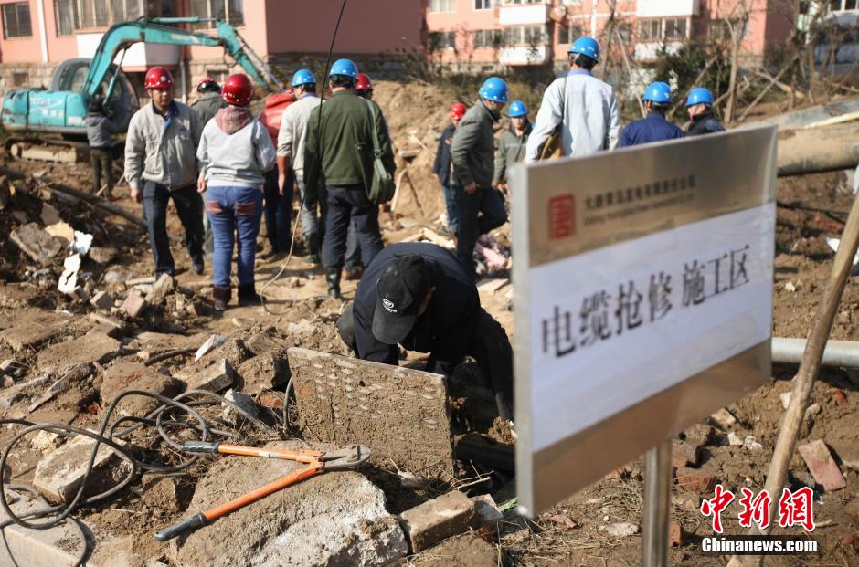 青島爆燃事故現(xiàn)場 緊張搶修電力設(shè)施