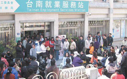 昨天各地就業服務站被擠爆,“勞委會”緊急將服務時間延長兩小時到晚上七點。據統計,十一個大型就業服務站一天內涌進一萬六千人,是去年春節后第一天一千五百人的十倍多,其中近八成、約一萬兩千八百人請領失業給付,激增三十倍,去年開春后第一天只有四百四十人。