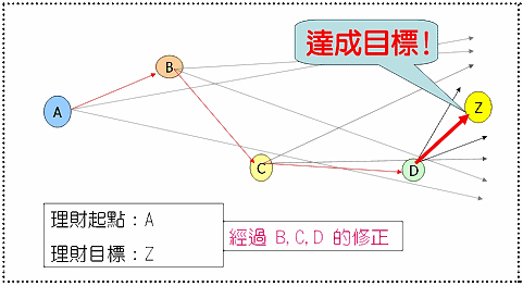 經過一段時間,理財階段來到了C點,似乎又偏離了當初既定的方向。就又是“適時調整”的時候,所以重新找出新方向,即從C點至Z點的雙箭頭所涵蓋的范圍。在投資理財的過程中,會不斷的重復B點、C點、D點等的修訂調整。