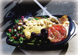 五谷雜糧和全麥谷物對健康的重要性不在話下,也是地中海地區人民常攝取的食物。希臘有風行地中海地區的PITA面包,搭備面包的沾醬更是多采多姿,當地最著名的沾醬,幾乎都是以新鮮蔬菜加上橄欖油或優格調制而成,讓人可嘗到時蔬的鮮脆滋味。新鮮蔬果不虞匱乏的希臘,此地人民看待蔬菜、水果不僅止于配菜或盤飾,而是將其營養與美味發揮至極致,如蕃茄、青椒、洋蔥、茄子、小黃瓜、蔾豆、西洋芹、大蒜等,都是入菜的好材料,有了這些鮮活佐料,更讓希臘美食增色不少!此外,以油、醋腌漬的各式蔬菜、橄欖,希臘人稱之為MEZEDES,則是小酒館里常見的下酒菜。得天獨厚的希臘三面環海,擁抱海洋的恩惠─海鮮并不難,豐富的新鮮漁獲如魚、蝦、蟹、干貝、蛤蜊等,可輕易變化餐桌上的菜色。另外,隨處可見的干果零嘴攤販,擺滿花生、杏仁果、開心果、無花果、葡萄干等干果,最能展現希臘的街頭風情。