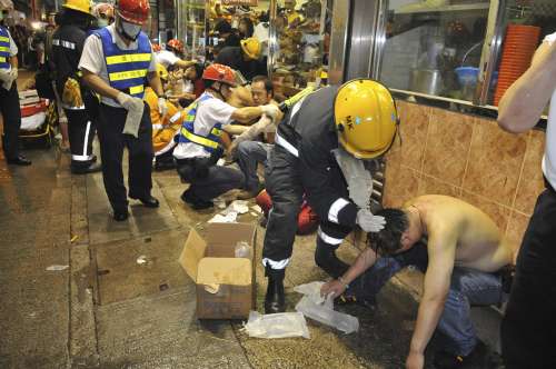 不少行人被鏹水彈濺傷,由救護員清洗及包扎。圖片來源:大公報
