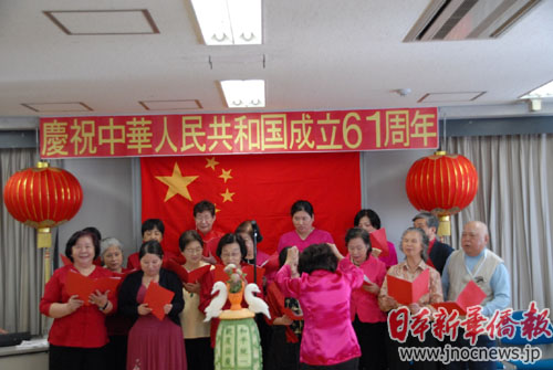 東京各界華僑和應邀前來參加活動的日中友好會館、在日朝鮮人總聯合會、在日大韓民國民團、日本新華僑華人會、在日中國企業協會、日本中華總商會、橫浜華僑總會、長野華僑總會等團體在中華人民共和國61年國慶前夕齊聚一堂,華人華僑的愛國思鄉之情涌上心頭。席間,東京華僑婦女會會長吳少煖帶領婦女會員們為大會獻唱一曲《五星紅旗》,不僅抒發了大家思念之情,更激發了眾人的愛國激情。吳少煖包含激情地表示:“我們獨在異鄉為異客,每逢佳節倍思親。雖然身在異鄉,但是思念祖國的心是一直沒有改變過的。望祖國今后更加繁榮富強。”