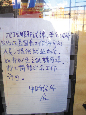 報(bào)道指出,在7日執(zhí)法行動中有一名石姓女子被捕的中日職業(yè)介紹所仍繼續(xù)關(guān)門,8日一早門上就張貼出中英文告示,明確告訴找工者必須有工作許可證。