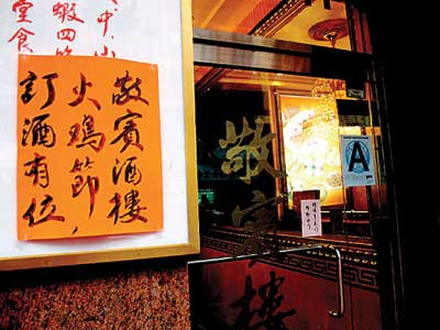 華埠東百老匯的敬賓酒樓雖然近日才貼出火雞節宴席預訂告示,但業者介紹預訂活動早在一年前便開始,宴席也已被訂走大半。