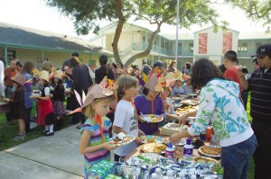 在18日的感恩節聚會上,家長們與老師們配合,給孩子送上美味的食品。(蔚宇)