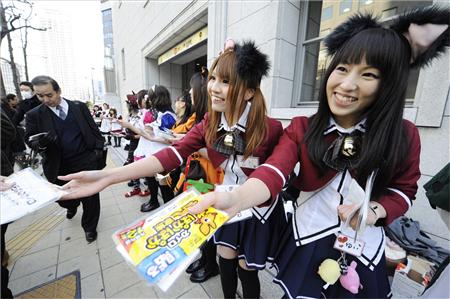 據報道,“女仆們”聚集在以“御宅街”聞名的大阪日本橋上,這樣做的目的是要鼓勵因經濟不景氣而易陷入消沉的上班族。來來往往的行人看到這番不同于往常的景象都感到吃驚,但也有人面露羞澀的微笑或是拿出照相機留念。