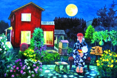 黑藍色的夜空,掛著冰鏡碧玉般的月亮,柔柔的月光下,一個穿著藍底白花夏日和服(浴衣)的日本女性,坐在院子里長滿鮮花綠草的木桌旁,桌子上放著一封開啟的信件,她的眼神是寂寞、憂傷,是祈念、期待。她在等待誰?又在祝福誰?畫的題目是“但愿人長久”。