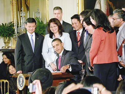 14日參與簽署行政命令儀式的還有國會眾議員吳振偉、本田、高光映、國內安全部法律總顧問方富宇(Ivan K. Fong)、勞工部婦女局美中區主任、“全美亞太裔支持奧巴馬領袖委員會”共同主席張秀賢,以及奧巴馬的妹婿吳加儒等。