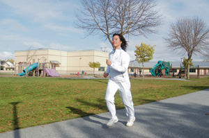 岑潔儒在小區公園練跑,要為下周傳圣火盛事,作好準備。(加拿大《星島日報》)