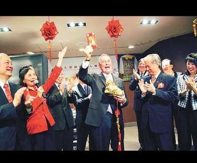 中新網2月25日電 據美國《僑報》報道,紐約市長彭博23日來到華策會人瑞中心,向華裔耆老拜年。人瑞中心主任伍寶玲按華人過年傳統給彭博送上仿真金馬、金虎和紅包,彭博喜笑顏開,開心地摸著虎頭,希望給紐約帶來好運。