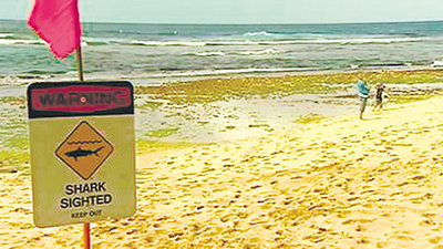 北岸海灘豎起沙魚警告牌示。 (美國《世界日報》網絡照片)