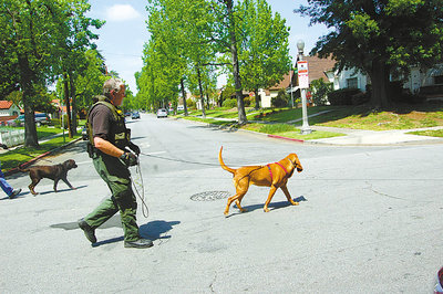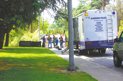 阿罕布拉市警方出動警犬,在女尸命案現場展開搜索,但并無所獲。 (美國《世界日報》/吳忠國攝影)